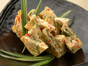 卵焼き器にサラダ油を入れて熱し、Gを3回くらいに分けて流し入れ、巻き込みながら焼き上げる。 |