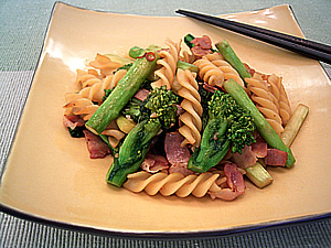 フライパンにサラダ油を入れて熱し、にんにく・輪切りとうがらしを入れて香りがでるまで炒め、ベーコン・菜の花・グリーンアスパラ・フィリージを入れて具材が温まるまで炒める。 |