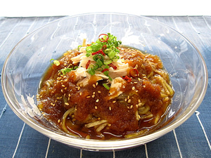 6.にたれをかけて刻みねぎ・輪切りとうがらしを飾り、白ごまを散らす。 |