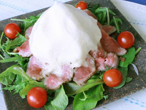 器にベビーリーフ・玉ねぎを盛ってローストビーフ・ミニトマトを盛り、中央部分にCをふんわり盛る。 |