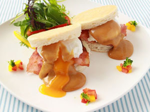 器にイングリッシュマフィン・ベーコン・ポーチドエッグ・ソースを写真のように盛ってパプリカ・ベビーリーフを添え、